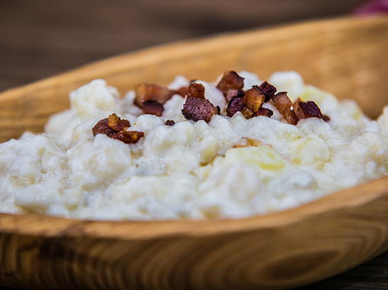 อาหารสโลวักสามารถภาคภูมิใจในผลิตภัณฑ์นมหลายชนิด เช่น parenica, oštiepok, korbáčik หรือ bryndza Oštiepok เป็นชีสรูปไข่นึ่งกึ่งแข็งที่ทำจากนมวัวและแกะ การสูบบุหรี่จะได้รสชาติและสีสันที่อร่อยเป็นพิเศษ เป็นชีสสโลวักแบบดั้งเดิมที่มีต้นกำเนิดจากคาร์พาเทียน อาหารจานโปรดคือเกี๊ยว - ญ็อกกีชิ้นเล็กๆ ปรุงจากมันฝรั่งดิบ คล้ายกับเกี๊ยวมีขน ต้มในน้ำเกลือแล้วทาด้วยไขมันและเสิร์ฟพร้อมบรินซา เบคอน กะหล่ำปลีหรือครีมเปรี้ยว พู่กันนั้นเป็นเกี๊ยวหรือย็อกกีที่ปรุงจากมันฝรั่ง เสิร์ฟพร้อมกะหล่ำปลีและเบคอน เดิมทีพายเป็นอาหารมื้อแรกในวันคริสต์มาสอีฟในครอบครัวสโลวัก เหล่านี้เป็นถุงยัดไส้รูปครึ่งวงกลมหรือสามเหลี่ยมซึ่งเตรียมจากมันฝรั่งแป้งไข่และเกลืออีกครั้ง พายเต็มไปด้วยเนื้อรมควันสับหรืออื่น ๆ บรินซาหรือกะหล่ำปลีและเสิร์ฟครีมเปรี้ยว เกี๊ยวยัดไส้เป็นอาหารพื้นบ้านอีกชนิดหนึ่ง ไส้ส่วนใหญ่มักจะเป็นเนื้อสัตว์ บรินซาและกะหล่ำปลี Lokše มาจากทางตะวันตกของสโลวาเกีย พวกเขาคือแพนเค้กมันฝรั่งที่ปรุงบนจานร้อน มีรสเค็ม - น้ำมันหมูสำหรับซุปหรือหวาน - ทาแยมและโรยด้วยเมล็ดงาดำ